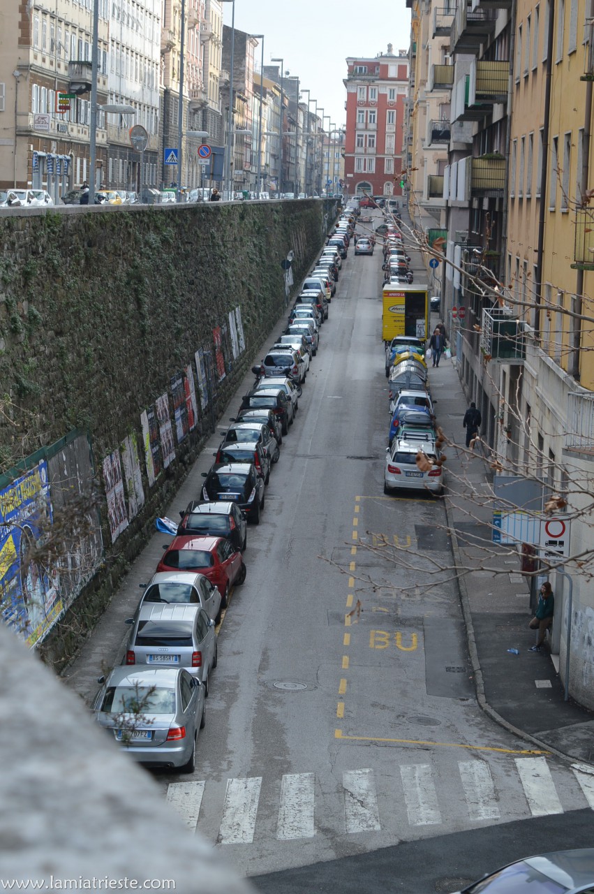 Verso l’inizio della via quasi di fronte l’Inps el verde de un per de alberi sporgi un poco sula via. Poco se li nota o almeno mi li go sempre visti, ma senza vederli. Solo adeso go zercà de capir e son entrà in quel che xè el giardin del retro del palazo Economo della Sopraintendenza alle Belle Arti che dà su piaza Libertà. El portonzin de fero ruzine che dà su la via Udine no se verzi ma se pol entrar da la via laterale, la via Tivarnella.