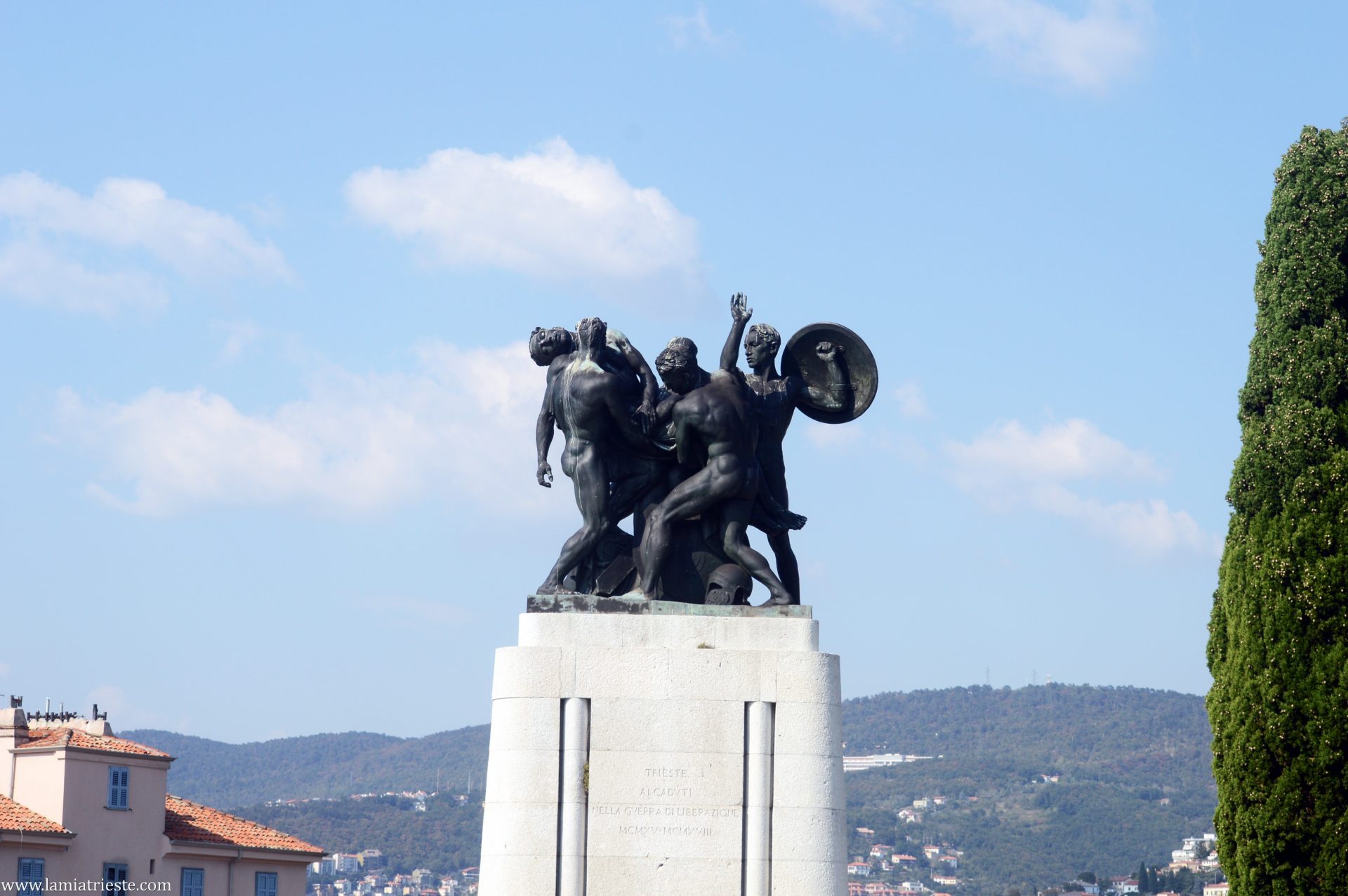 Breve l’incisione sulla pietra del basamento realizzato in pietra bianca d’Istria “Trieste — ai caduti — nella guerra di liberazione — MCMXV – MCMXVIII” (10)