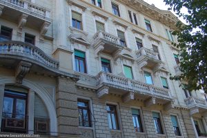 Meglio distrarre la mente da questa realtà. La severità del palazzo in pietra ingrigita dal tempo, a sinistra salendo dalla piazza, per fortuna richiama lo sguardo. La mano professionale di un architetto la si nota per la complessità della facciata. Su tutto dominano due aquile bicipiti – simbolo dell’impero austro-ungarico – che sembra essere stata la causa di un difficile e ritardato nulla osta di abitabilità dell’amministrazione italiana appena giunta dopo la prima guerra, quando il palazzo fu costruito con inizio nel 1914, architetto V. Angeli come targa apposta dal Rotary Club Trieste Nord ricorda.